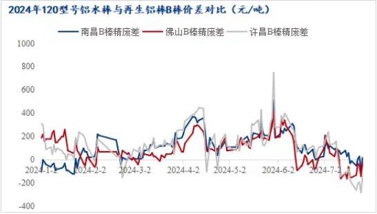 隨著鋁價的大幅回落,鋁水棒加工費也逐步回歸至往年中高位置。而再生鋁棒受廢鋁原材料高企制約,加上鋁價持續(xù)回落,企業(yè)長期處于虧損狀態(tài),再生鋁棒價格相比鋁水棒價格表現(xiàn)更加堅挺。就B棒而言,目前周均結(jié)算加工費在200-400元/噸,點價結(jié)算加工費在350-550元/噸,價格已趕超原生棒價格。7月份B棒精廢差在-300~100元/噸區(qū)間震蕩盤整,且長期處于負值,精廢差倒掛。在高生產(chǎn)成本下,企業(yè)不得不集體挺價保利接單,下游對目前價格接受度有限,多采購原生棒居多,再生鋁棒市場需求遇冷。