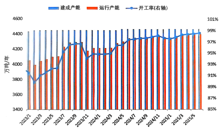 2025上半年,中國鋁行業(yè)生產(chǎn)總體較為穩(wěn)定,沒有出現(xiàn)因各種不可抗力因素導(dǎo)致的規(guī);瘻p產(chǎn),且隨著四川、貴州、青海等省/區(qū)電解鋁企業(yè)的復(fù)產(chǎn)和新建項(xiàng)目投產(chǎn),上半年生產(chǎn)能力得到持續(xù)提升。安泰科統(tǒng)計(jì),截至2025年6月底,中國電解鋁建成產(chǎn)能4470萬噸/年,其中運(yùn)行產(chǎn)能4405萬噸/年,較2024年底增加49萬噸。1-6月份產(chǎn)能利用率達(dá)98.1%,不斷刷新歷史新高,比去年同期高2.4個(gè)百分點(diǎn):其中6月份產(chǎn)能利用率達(dá)98.5%,較2024年末高0.9個(gè)百分點(diǎn)。2025上半年,中國電解鋁產(chǎn)量約為2184萬噸,同比增加2.4%。