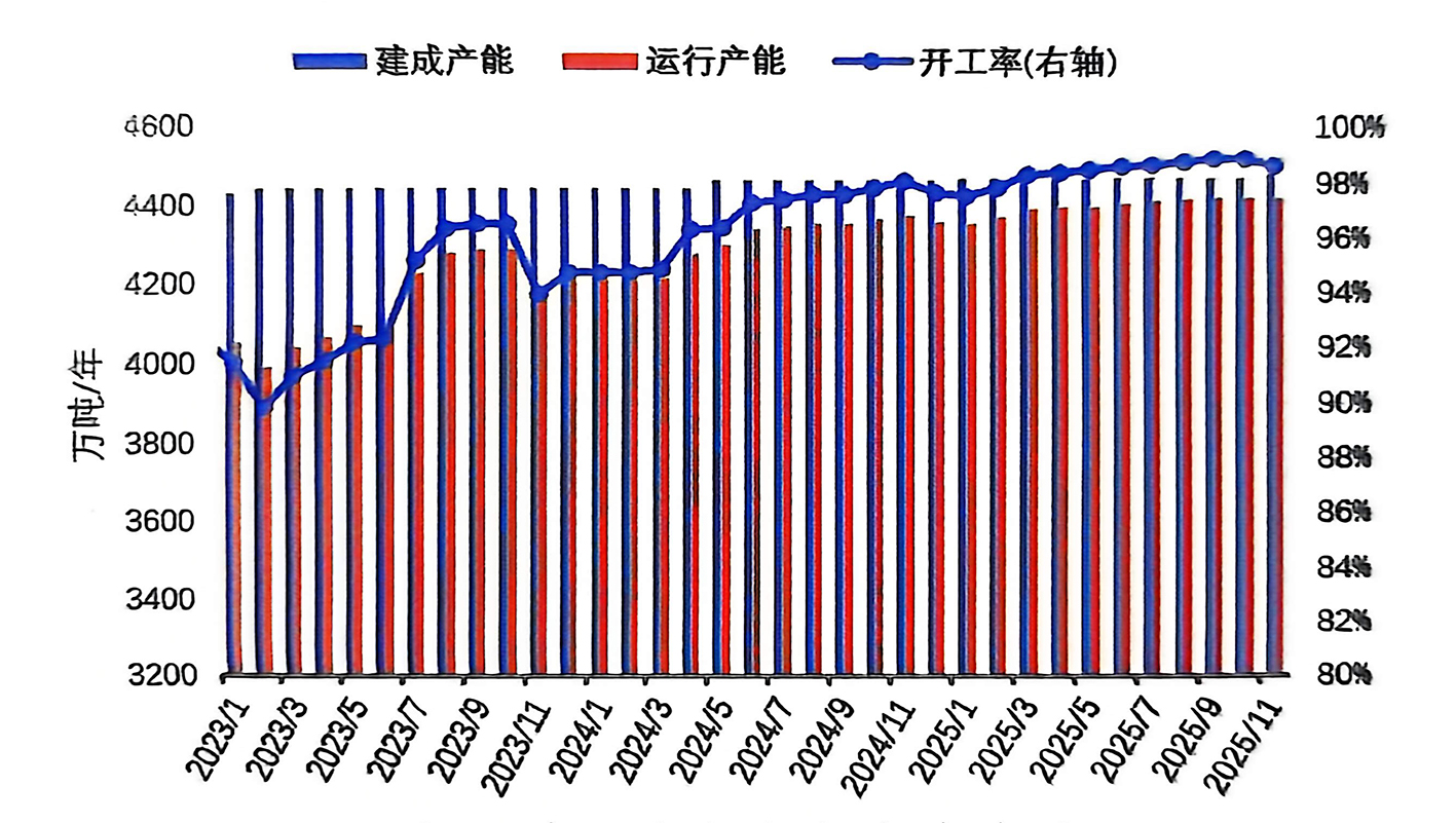 2025年11月,國(guó)內(nèi)電解鋁生產(chǎn)能力高位平穩(wěn)增長(zhǎng)。截至11月底,建成產(chǎn)能4483萬噸/年,運(yùn)行產(chǎn)能4421萬噸/年,環(huán)比增加1萬噸/年,總體生產(chǎn)力穩(wěn)定,生產(chǎn)布局仍在穩(wěn)步推進(jìn)。2025年11月20日,新疆維吾爾自治區(qū)工業(yè)和信息化廳發(fā)布了新疆其亞鋁電有限公司21萬噸電解鋁建設(shè)項(xiàng)目產(chǎn)能置換方案的公告。該項(xiàng)目位于新疆準(zhǔn)東經(jīng)濟(jì)技術(shù)開發(fā)區(qū)環(huán)城西路451號(hào),槽型為預(yù)計(jì)500kA*156臺(tái),產(chǎn)能指標(biāo)來自新疆其亞鋁電有限公司,擬于2025年11月開工,2026年12月建成投產(chǎn)。11月26日,天山鋁業(yè)140萬噸電解鋁綠色低碳能效提升改造項(xiàng)目首批120臺(tái)電解槽正式開始通電啟槽,為未來140萬噸/年產(chǎn)能滿產(chǎn)運(yùn)行奠定堅(jiān)實(shí)基礎(chǔ)。扎鋁二期35萬噸/年計(jì)劃于12月20日通電,該項(xiàng)目是國(guó)家電投集團(tuán)打造“源網(wǎng)荷儲(chǔ)直供”新范式的標(biāo)志性工程,采用500kA電解槽技術(shù),2026年全面達(dá)產(chǎn),投產(chǎn)后綠電占比將達(dá)80%。預(yù)計(jì)2025年底建成產(chǎn)能將達(dá)到4525萬噸/年。目前,在產(chǎn)能接近“天花板”和開工率始終維持98%以上的背景下,后續(xù)產(chǎn)量和產(chǎn)能的增長(zhǎng)空間非常有限。