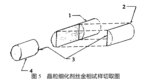 絲:從一卷任意部取一段要求重量的晶粒細化劑;金相檢驗試樣的縱、橫截面如圖5所示;機械性能測量試樣長度應(yīng)保證300mm。