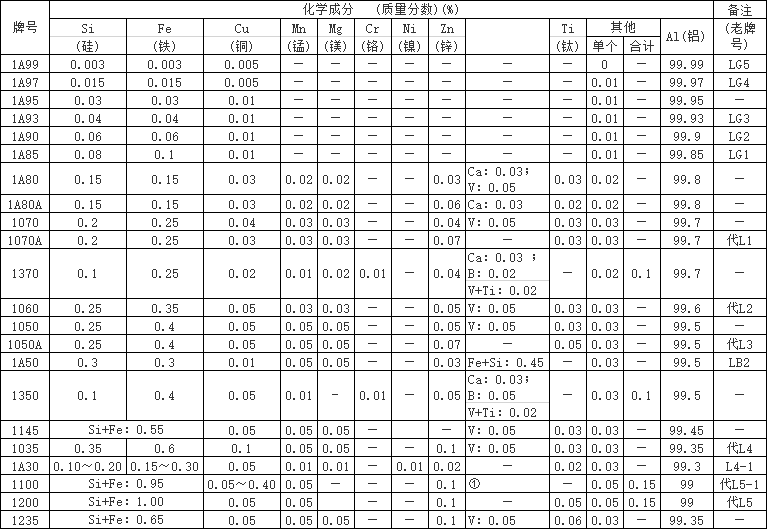 7-1系列純鋁及鋁合金牌號(hào)及化學(xué)成分表: