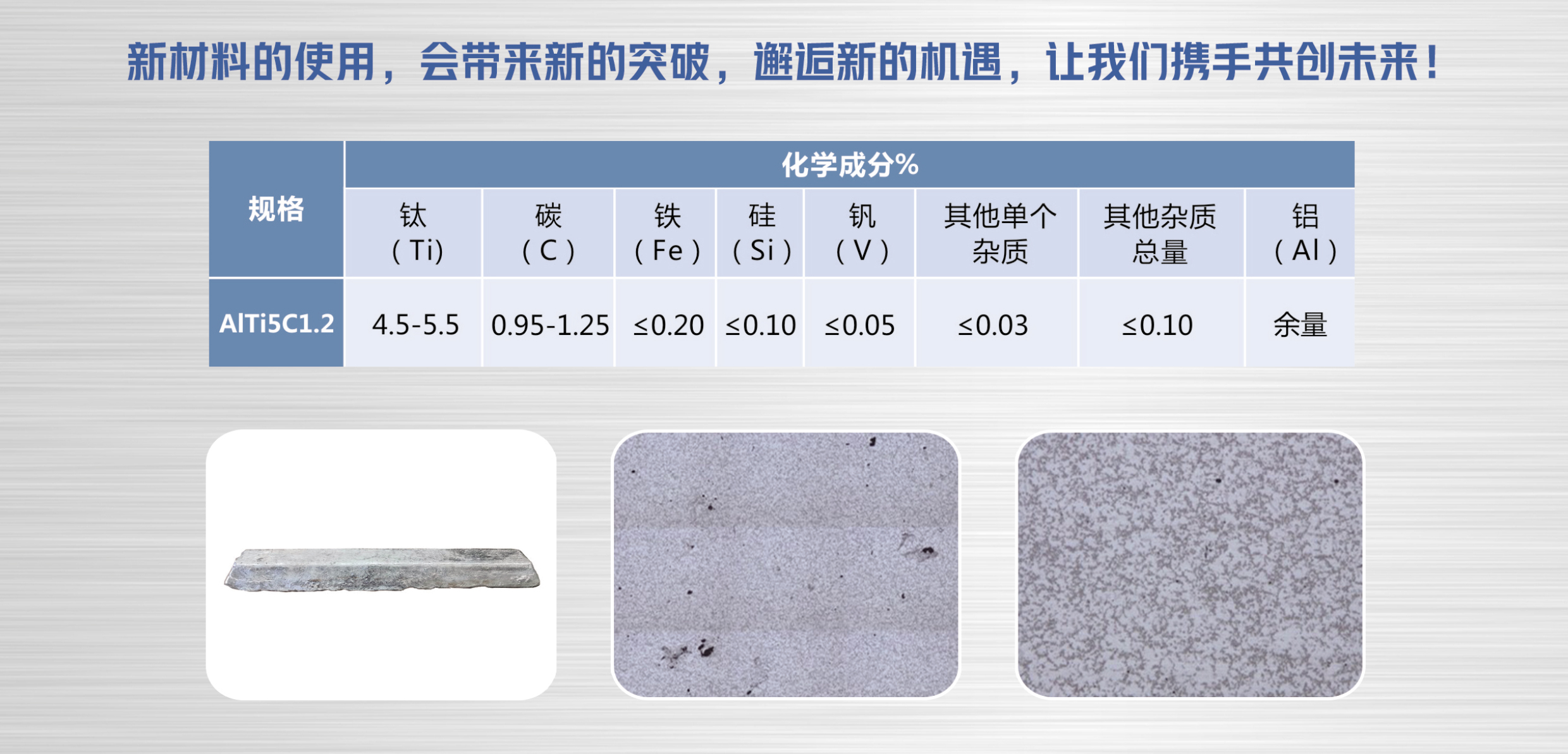 1.AITi5C1.2中TiC陶瓷顆粒時效性可達(dá)6個小時,適用于爐內(nèi)添加,操作簡便,適用于大部分需要提升機械性能的變形鋁合金產(chǎn)品及鑄造鋁合金產(chǎn)品;