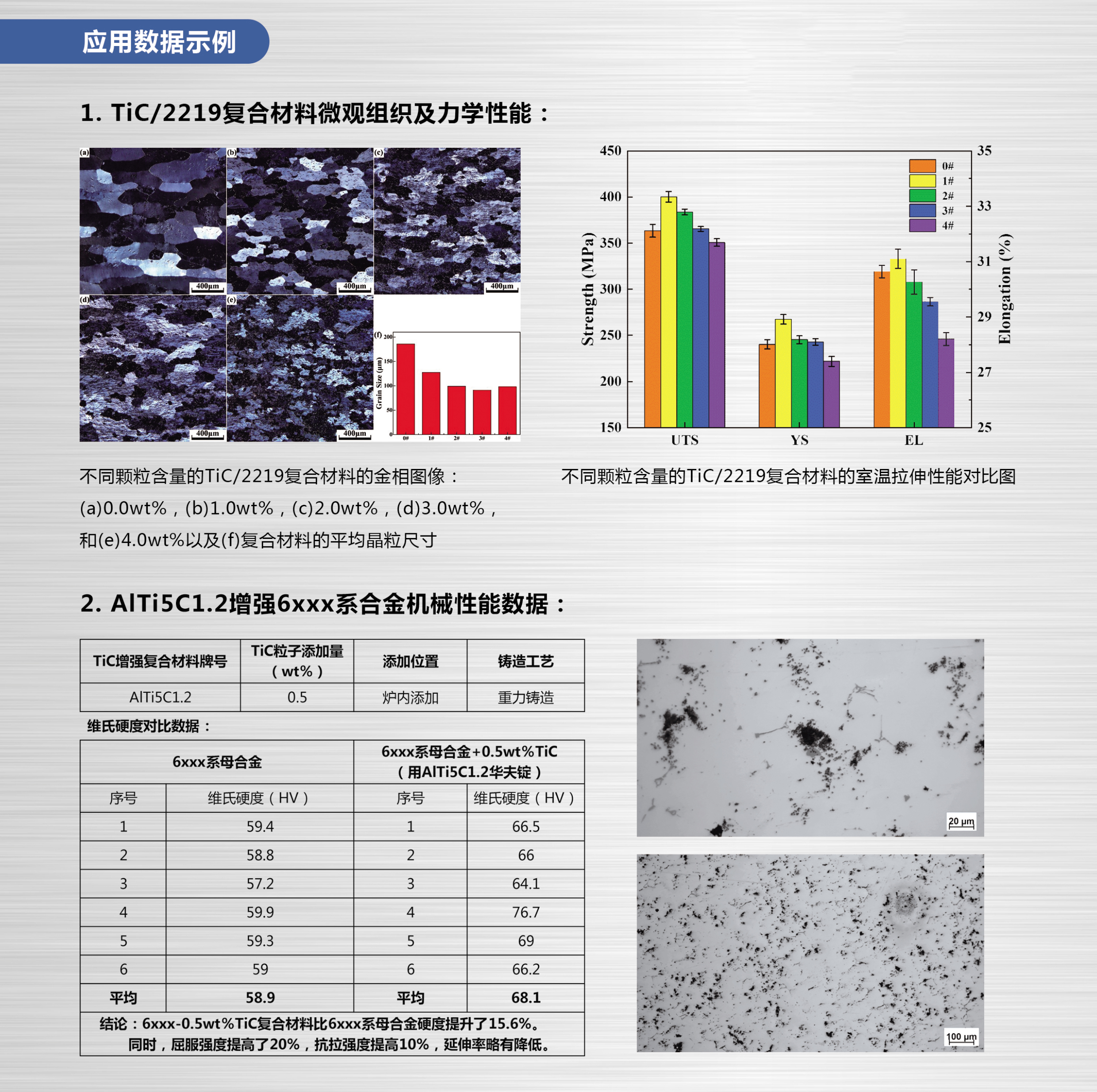 我司(秦皇島峰越科技)推出TIC增強型復(fù)合材料,可提高鋁材高溫力學(xué)性能20%。目前以物理混合形式最多只能在鋁材中加入0.9%質(zhì)量分?jǐn)?shù)的TIC粒子,再多會產(chǎn)生團(tuán)聚現(xiàn)象,而我司TIC復(fù)合材料可達(dá)6%質(zhì)量分?jǐn)?shù),顯著提高鋁材的抗拉強度和屈服強度。